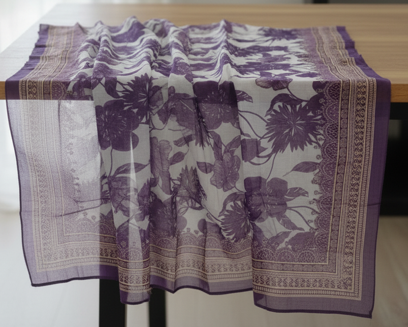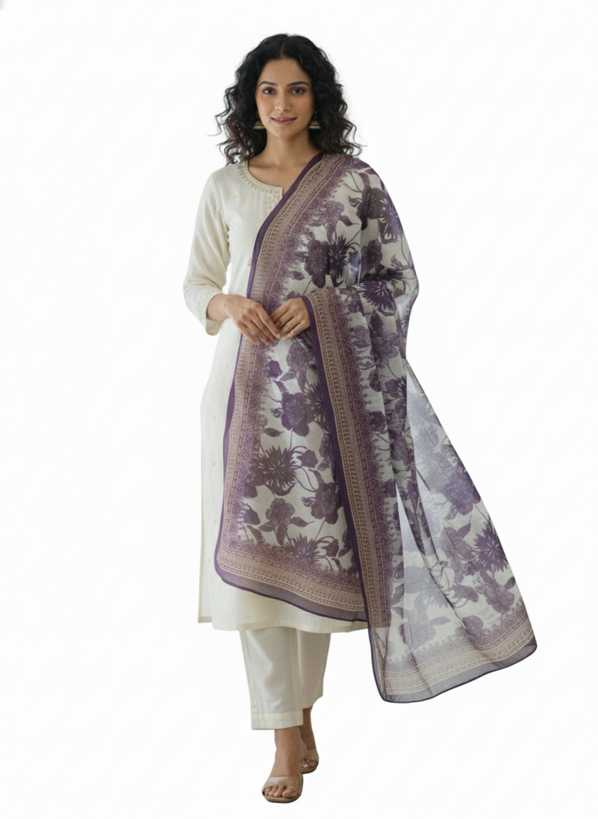 White and Purple Floral Digital Print Organza Dupatta for Women