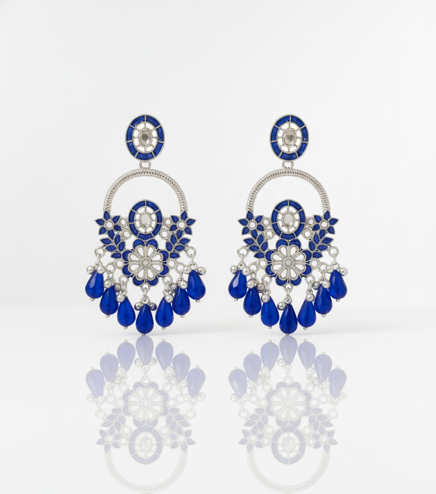 Elevate your ethnic look with these stunning Blue Kundan and Pearl Drop Earrings from Joshi Fashion. Crafted in silver-plated brass, these traditional chandelier-style jhumkas are enhanced with Meenakari detailing, Kundan work, and blue glass beads that add a vibrant and festive charm.
