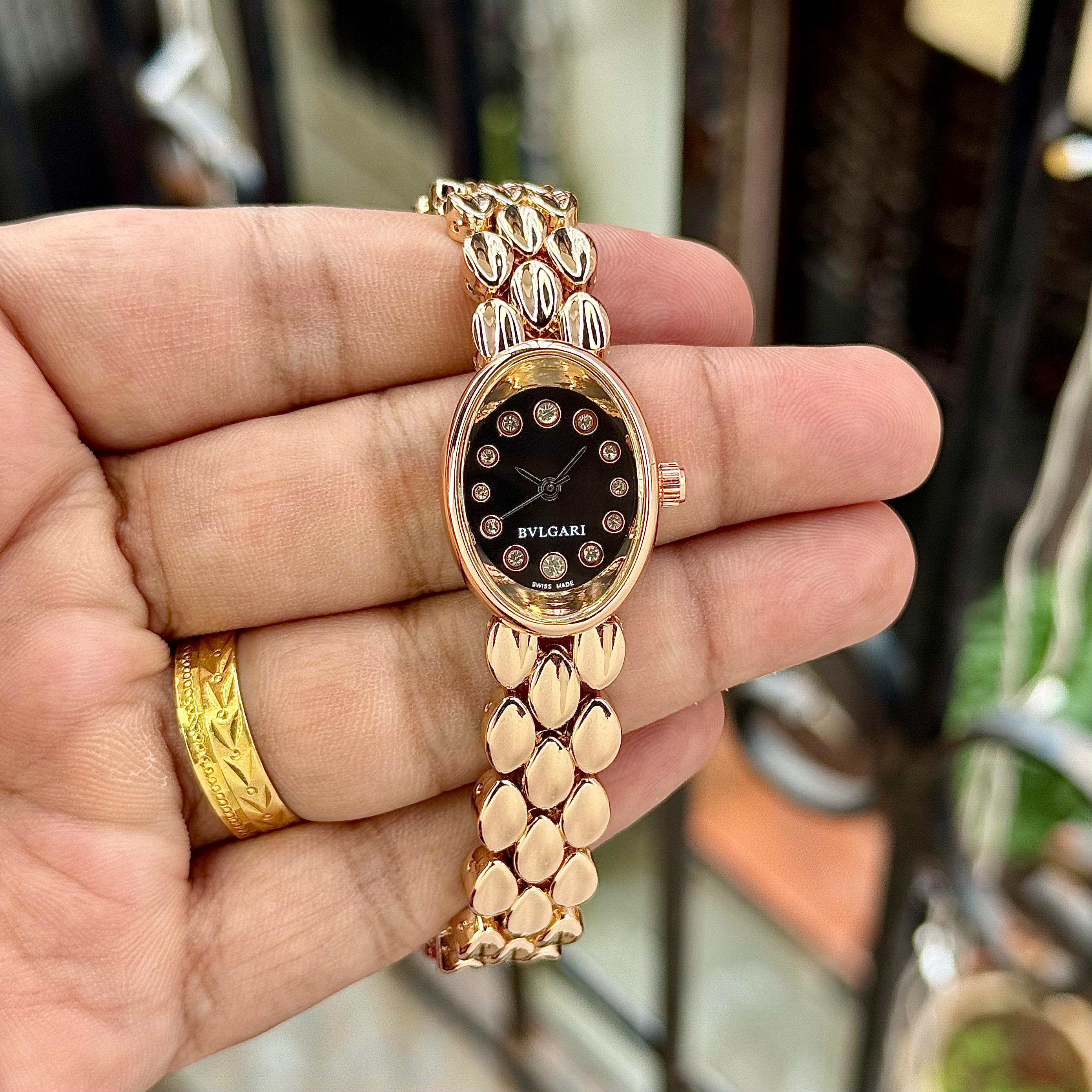 The signature diamond-studded oval dial (28mm) comes in three rich shades – Champagne, White, and Black, each complemented by diamond-style hour markers for an extra touch of sparkle. A rose-gold tone oval case pairs seamlessly with a Serpenti-scale bracelet, creating a truly luxurious silhouette. Powered by a Swiss quartz movement and protected by scratch-resistant glass, this elegant piece is lightweight, stylish, and designed for all-day wear.