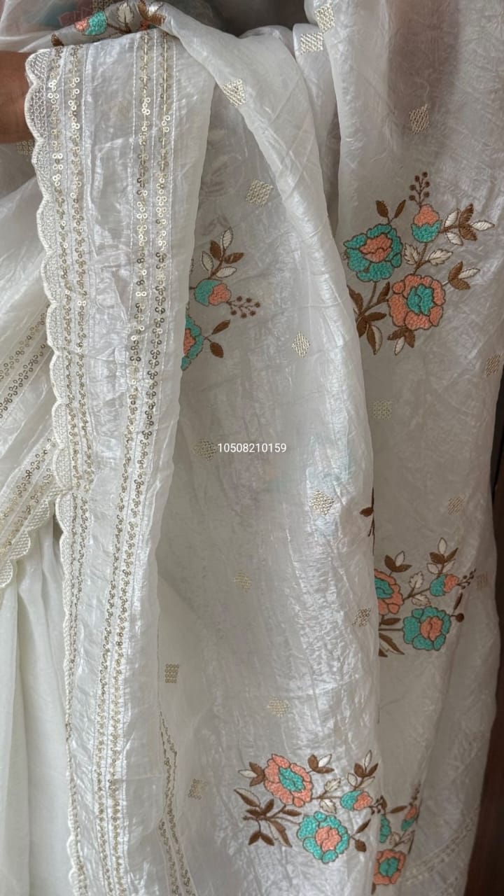 Step into sheer elegance with this Premium Crush Organza Saree from Joshi Fashion. Featuring a self-sequins weaving pattern all over, and finished with a scallop border, this saree offers a graceful and festive look. It comes with a contrast Kalamkari printed blouse, allowing for custom stitching up to 44”.