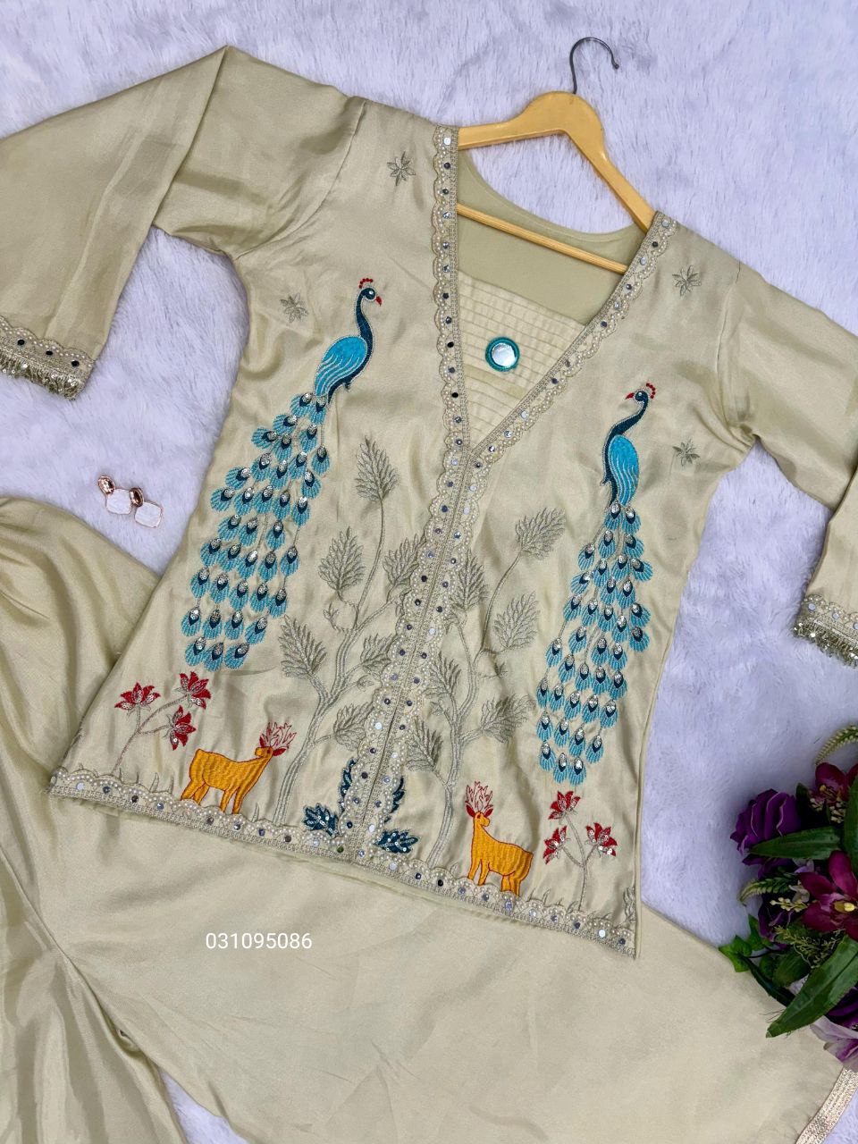 Step into elegance with this Beautiful Co-Ord Set from Joshi Fashion, designed to combine traditional charm with modern comfort. Made from premium Shimmar fabric, the top features full front embroidery with intricate moti and mirror work, enhanced by fancy lace detailing for an added festive touch.