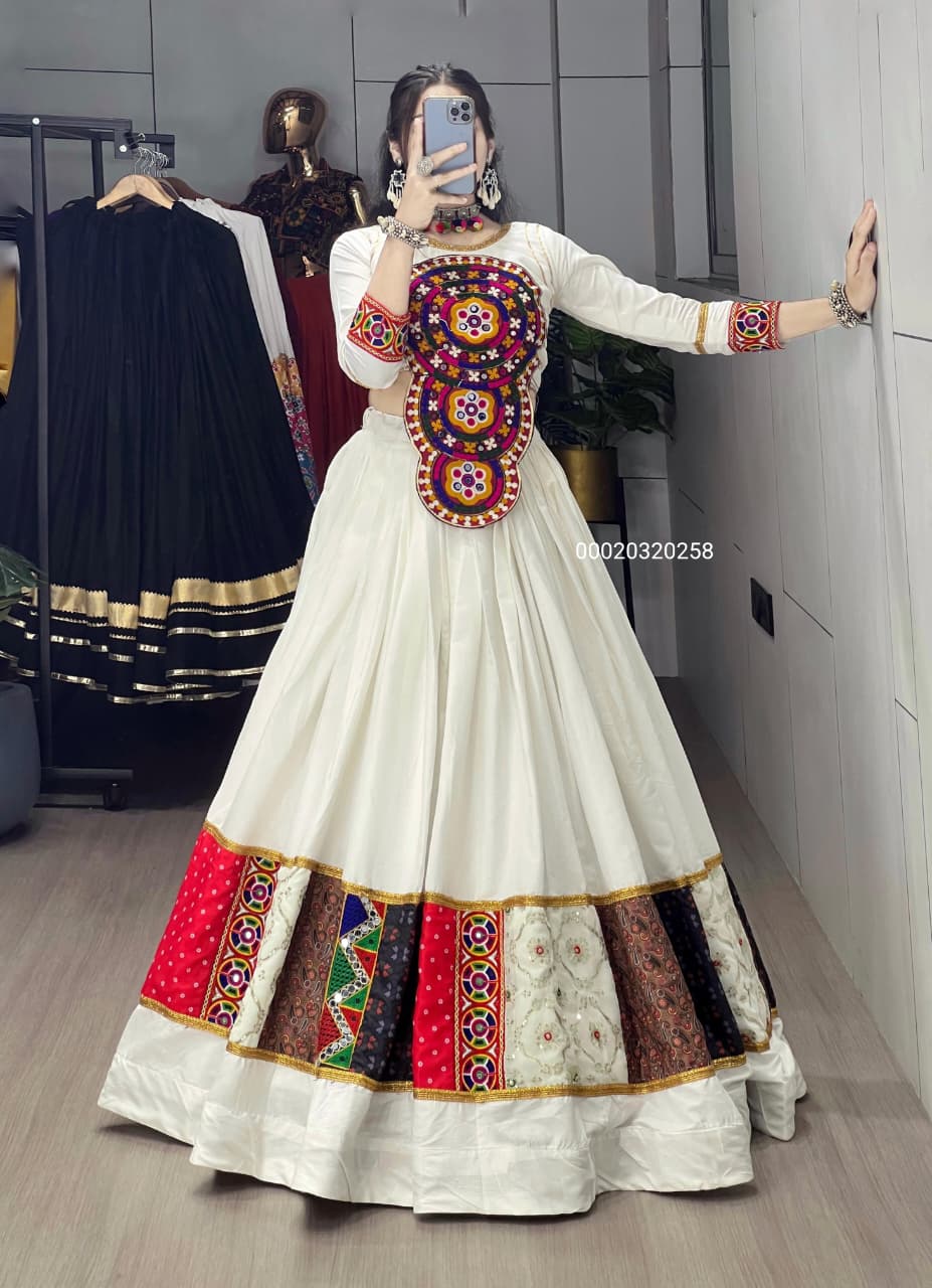 Paired with a fancy front-embroidered Kutchi-style top that features a stylish dori closure at the back, this set is designed to flatter and shine at festive events, garba nights, weddings, or cultural celebrations.