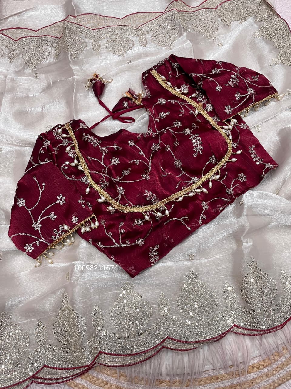 🌟 Blouse Work: Heavy Coding Sequin Embroidery with Moti Lace Finish