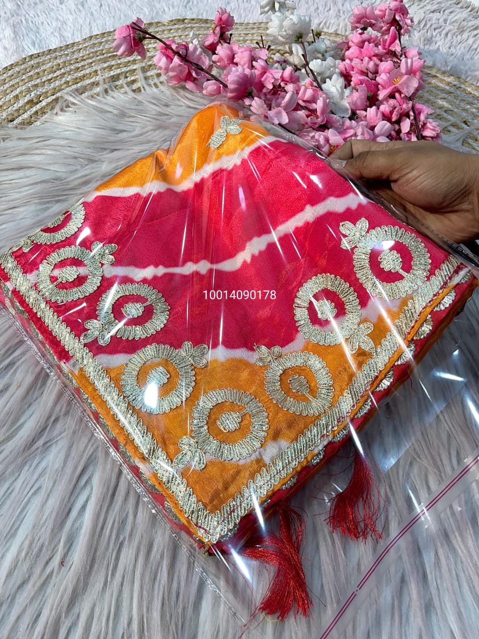 Stay ahead of the style game with this Latest Trending Saree from Joshi Fashion. Crafted from soft Chinon silk, the saree features a stunning Lehriya multi-prism design with heavy pallu ribbon gota work and delicate butti detailing all over. Paired with a heavy mono blouse (unstitched), it’s the perfect blend of tradition and trend.
