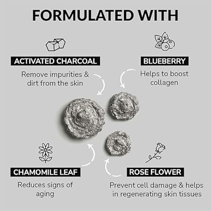 Active Ingredients Charcoal, Blue Berry, Chamomile Leaf, Rose flower