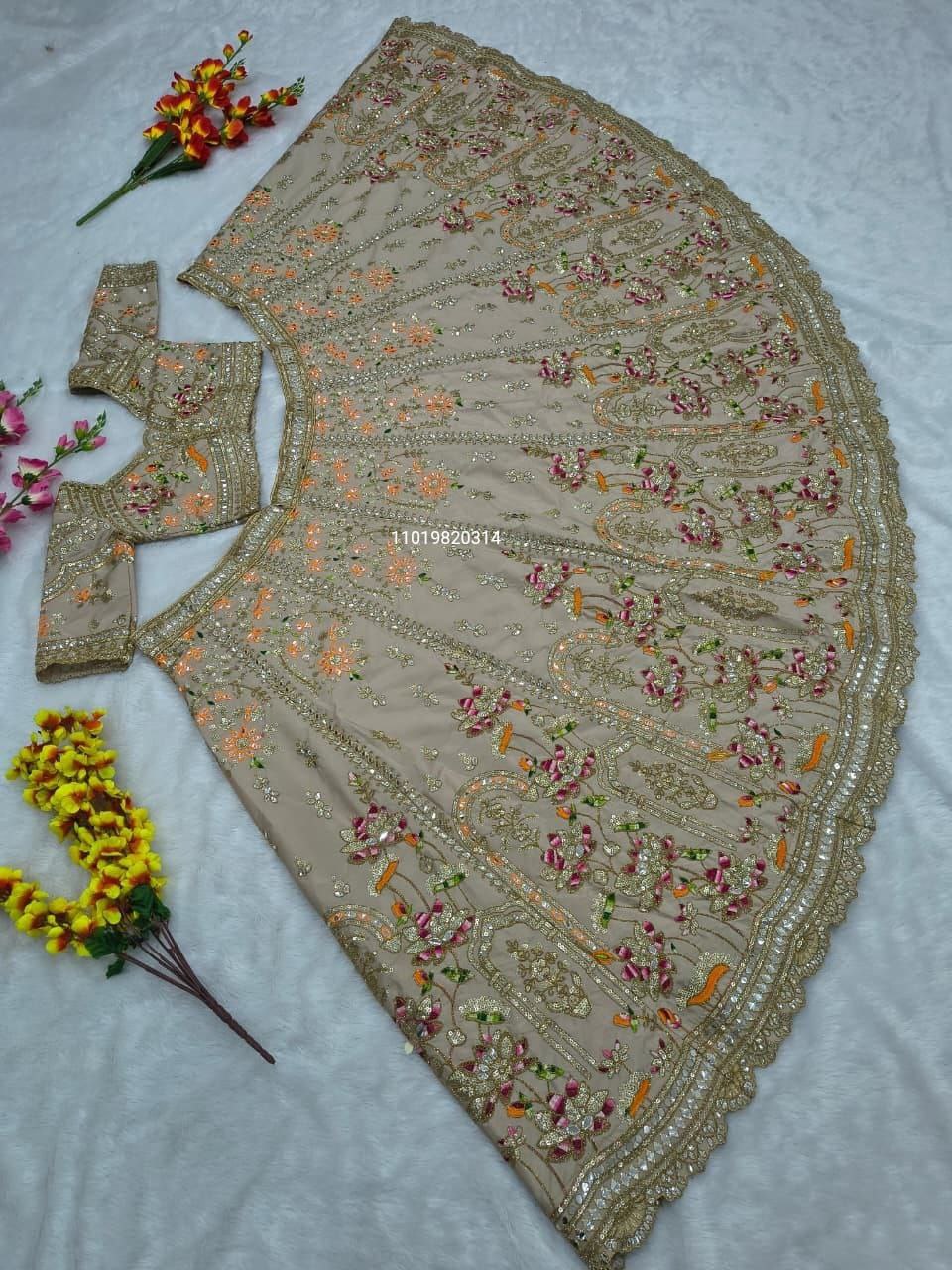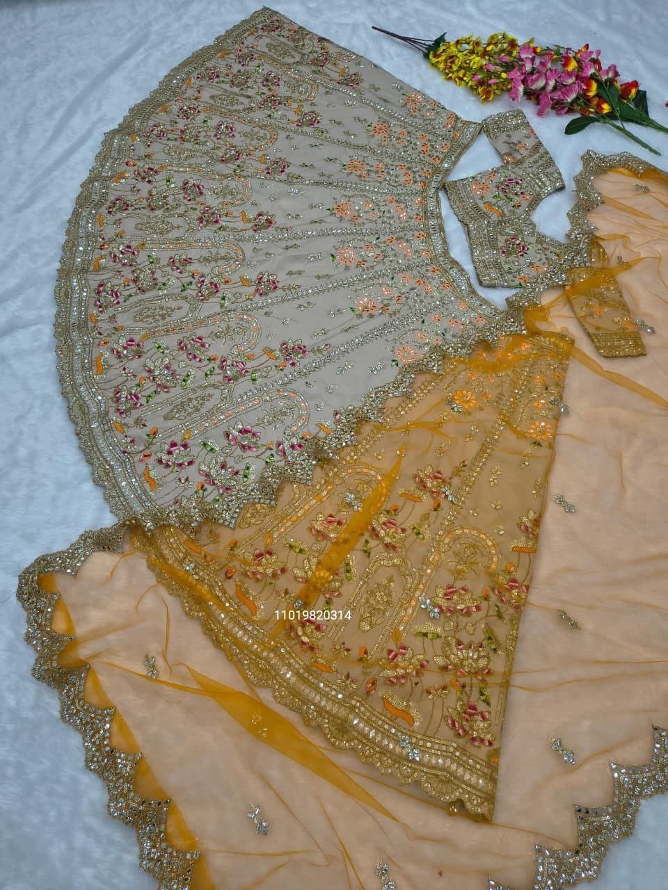 The lehenga features heavy cancan and canvas support with double inner covering, ensuring a voluminous and graceful fall. With a 3.30-meter flair, it offers a regal silhouette perfect for weddings and grand celebrations.