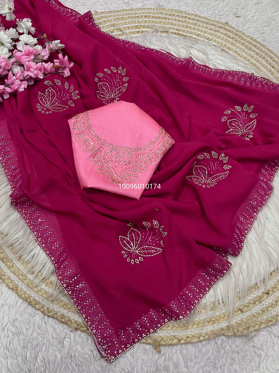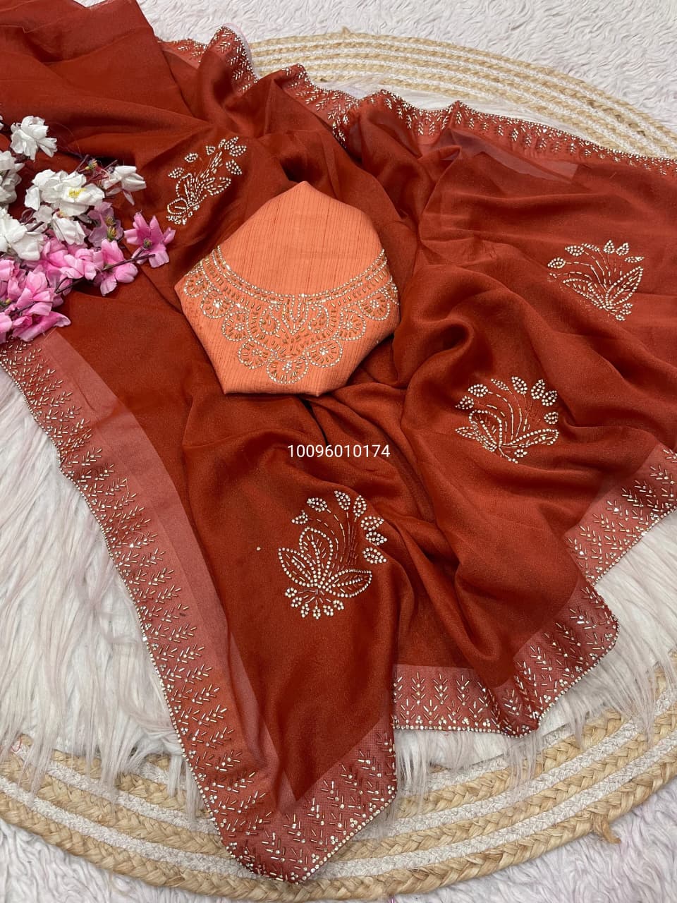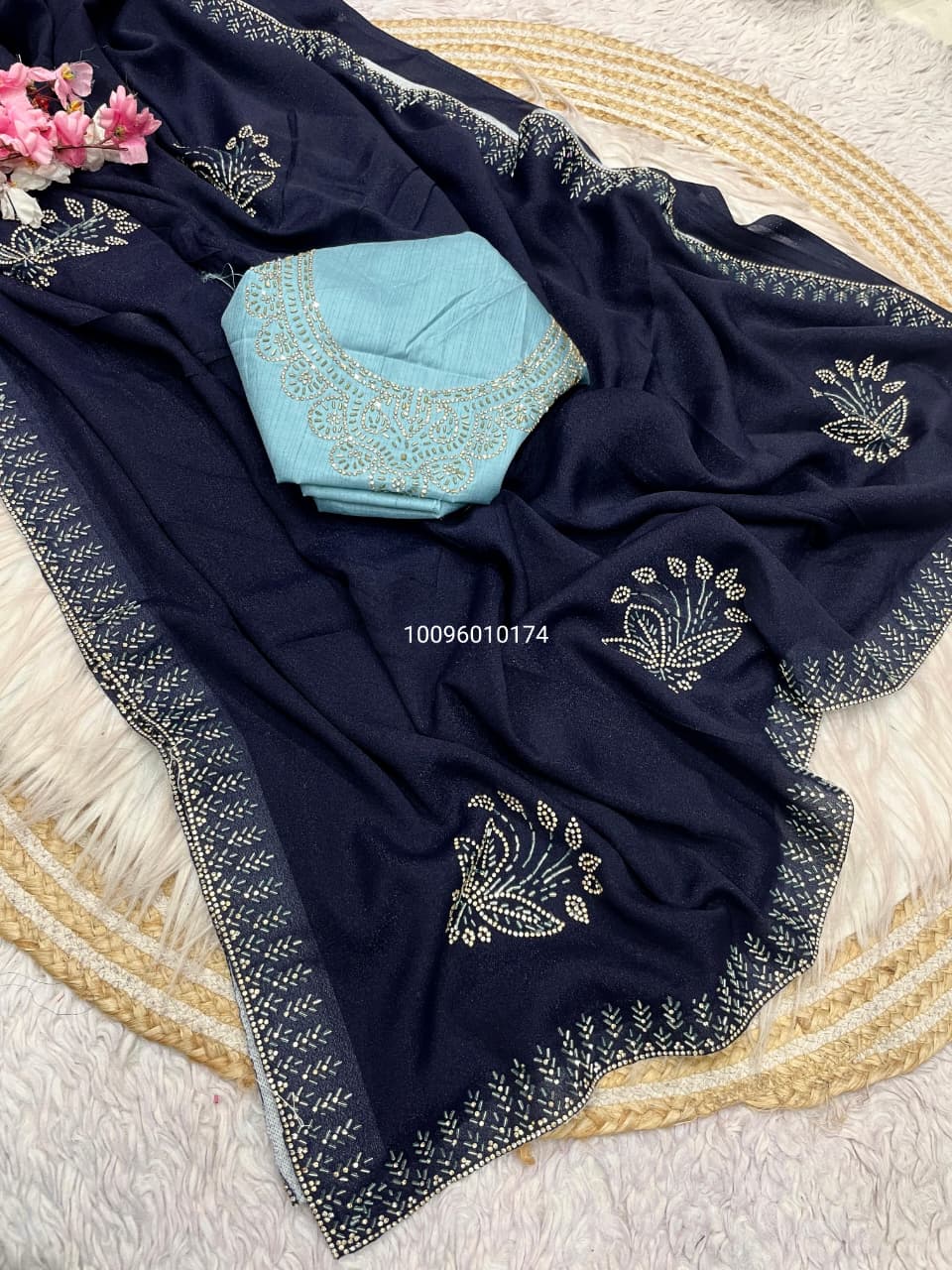 It comes with a Mono Banglori blouse embellished with matching Jarkhan work, adding richness and sophistication to your entire ensemble. Whether you’re attending a wedding, party, or special event, this saree makes a bold style statement with its sparkling detail and modern drape.