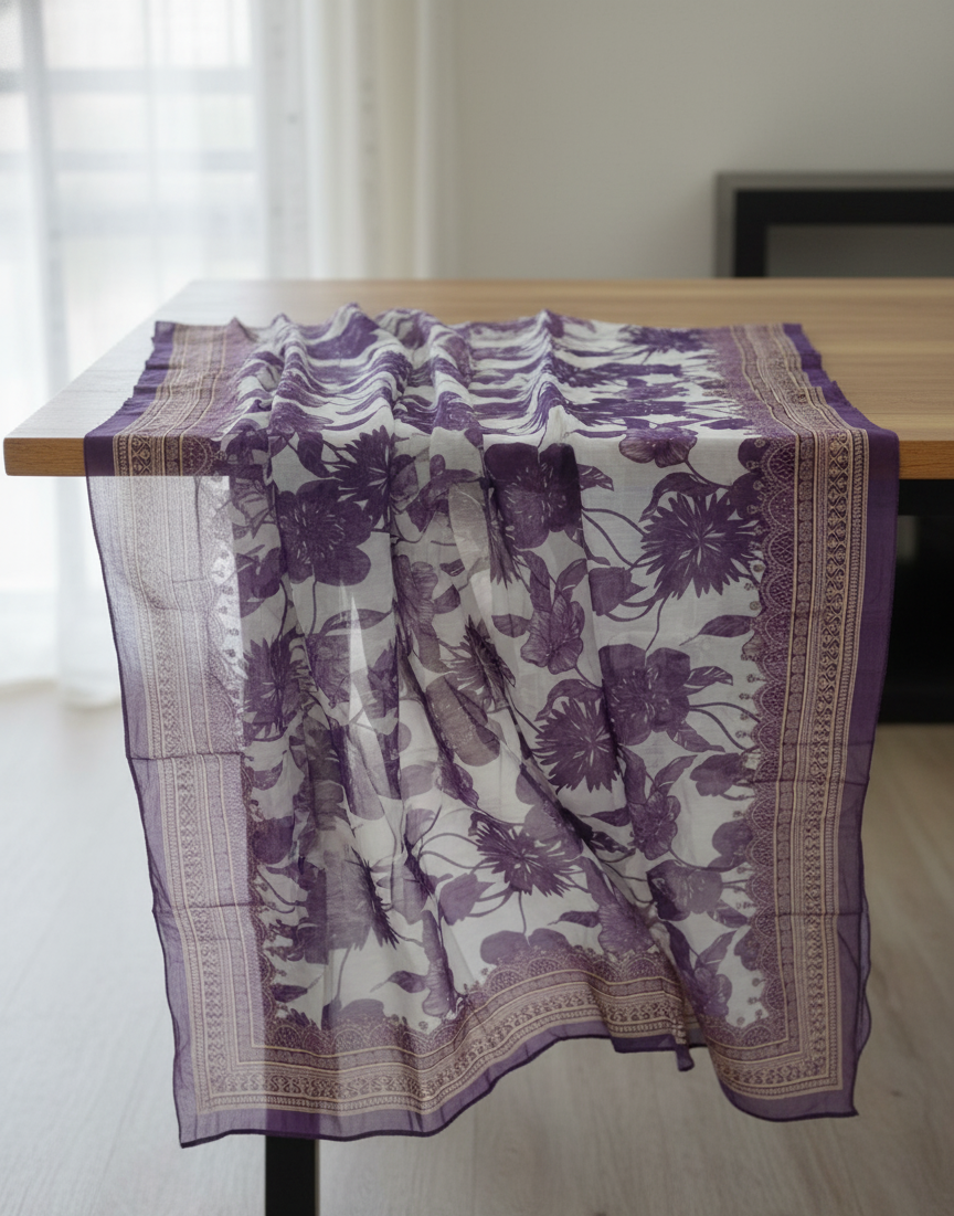 Elevate your ethnic ensemble with this White and Purple Flower Digital Print Organza Dupatta for Women. Made from premium-quality organza fabric, it features elegant floral digital prints that add a fresh and graceful charm. The lightweight, sheer texture ensures a soft drape and comfortable wear throughout the day. Measuring 68 x 216 cm, this dupatta offers ample coverage and styling versatility. Perfect for pairing with suits, kurtis, and festive outfits, it is ideal for casual gatherings, celebrations, and special occasions.