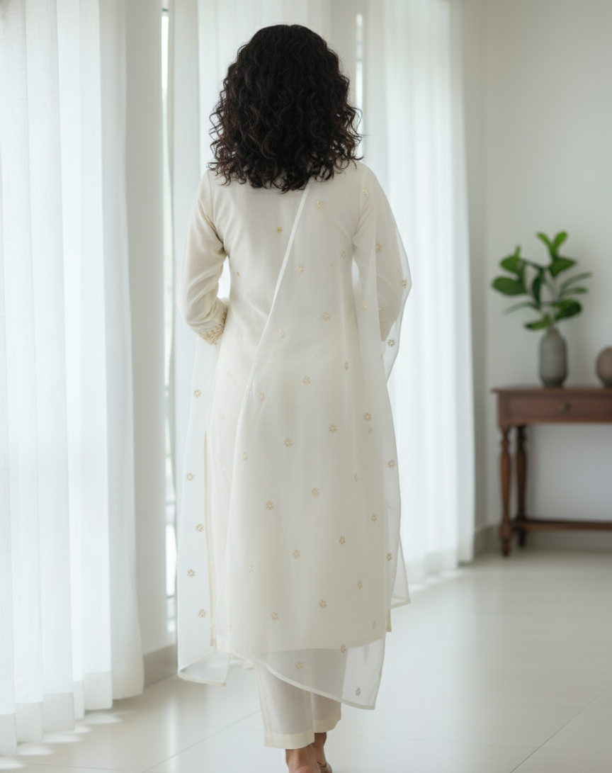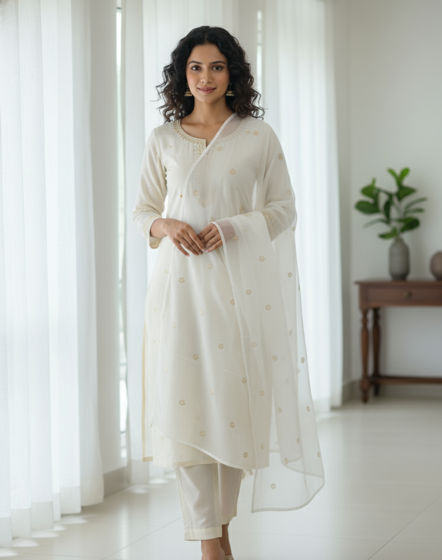Add timeless elegance to your ethnic wardrobe with this White Chanderi Silk Dupatta, beautifully adorned with traditional Gota Patti handwork. Crafted from premium Chanderi silk, it offers a soft texture, lightweight feel, and subtle sheen that enhances any outfit. The intricate hand-applied Gota Patti work reflects rich Indian craftsmanship, making it perfect for festive occasions, weddings, and celebrations. Measuring 89 x 220 cm, this dupatta provides graceful coverage and effortless draping when paired with suits, lehengas, or kurtis.