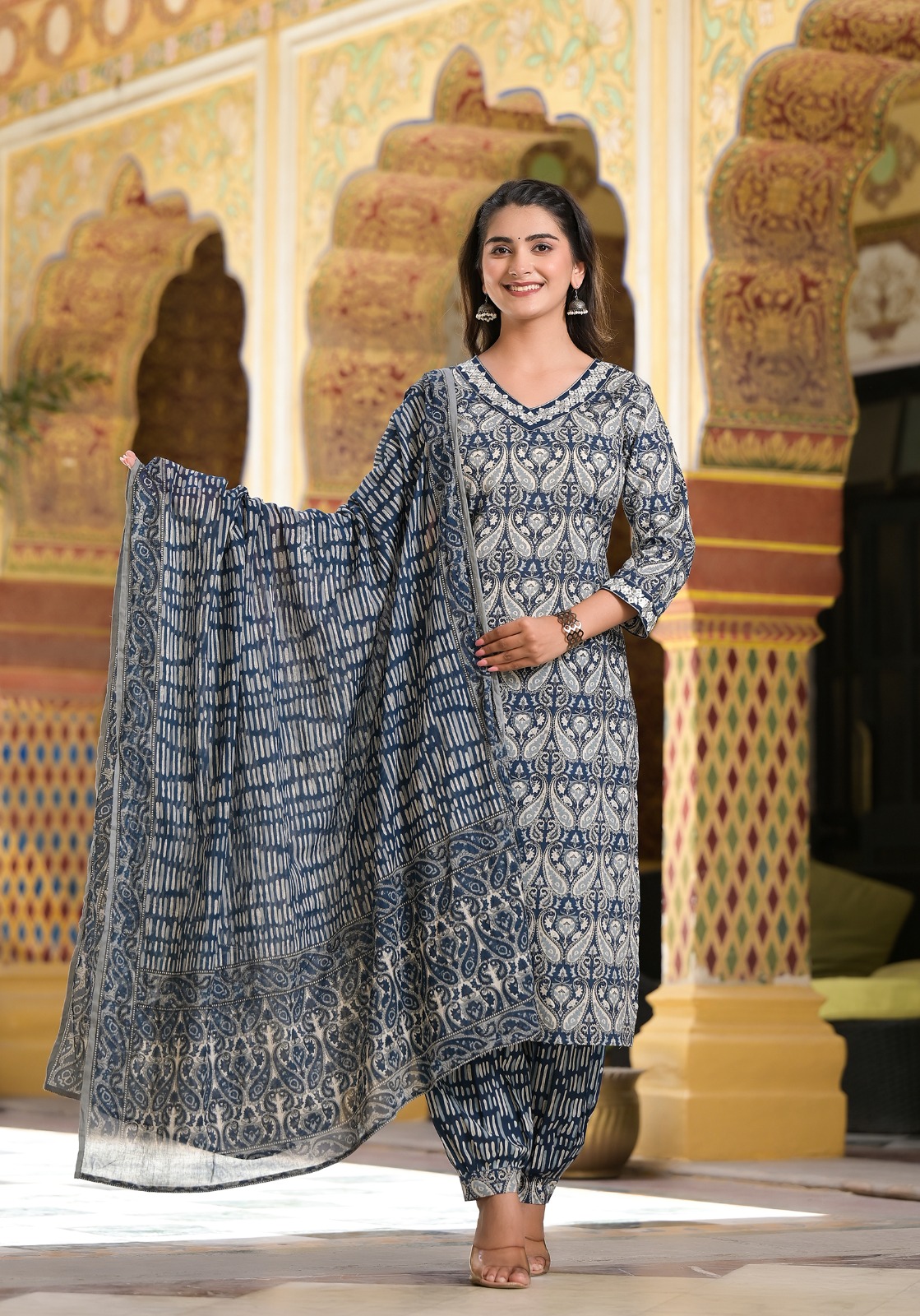 Sanganeri Print Anarkali Kurta Set – Cotton Malmal Dupatta