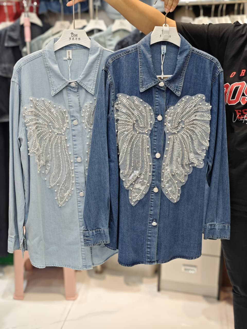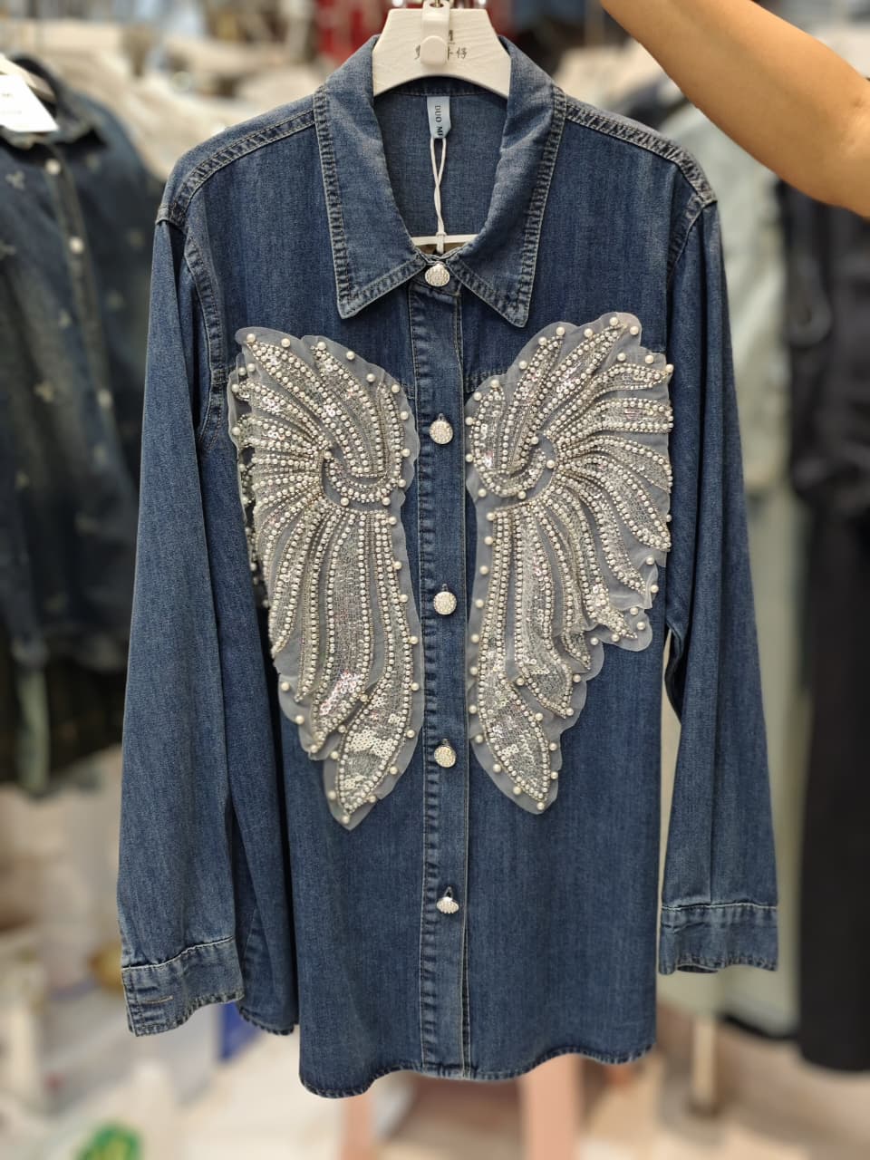 Luxury Pearl Embellished Denim Shirt