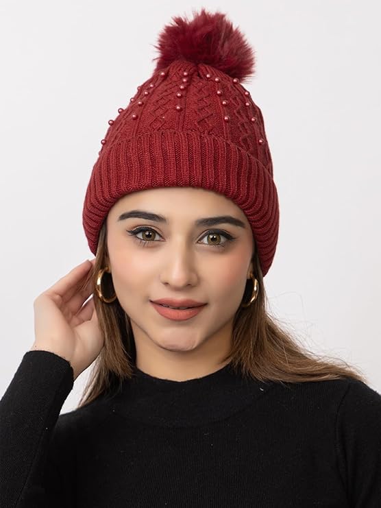 Women’s Woolen Soft Knitted Beanie Cap with Fleece – Burgundy